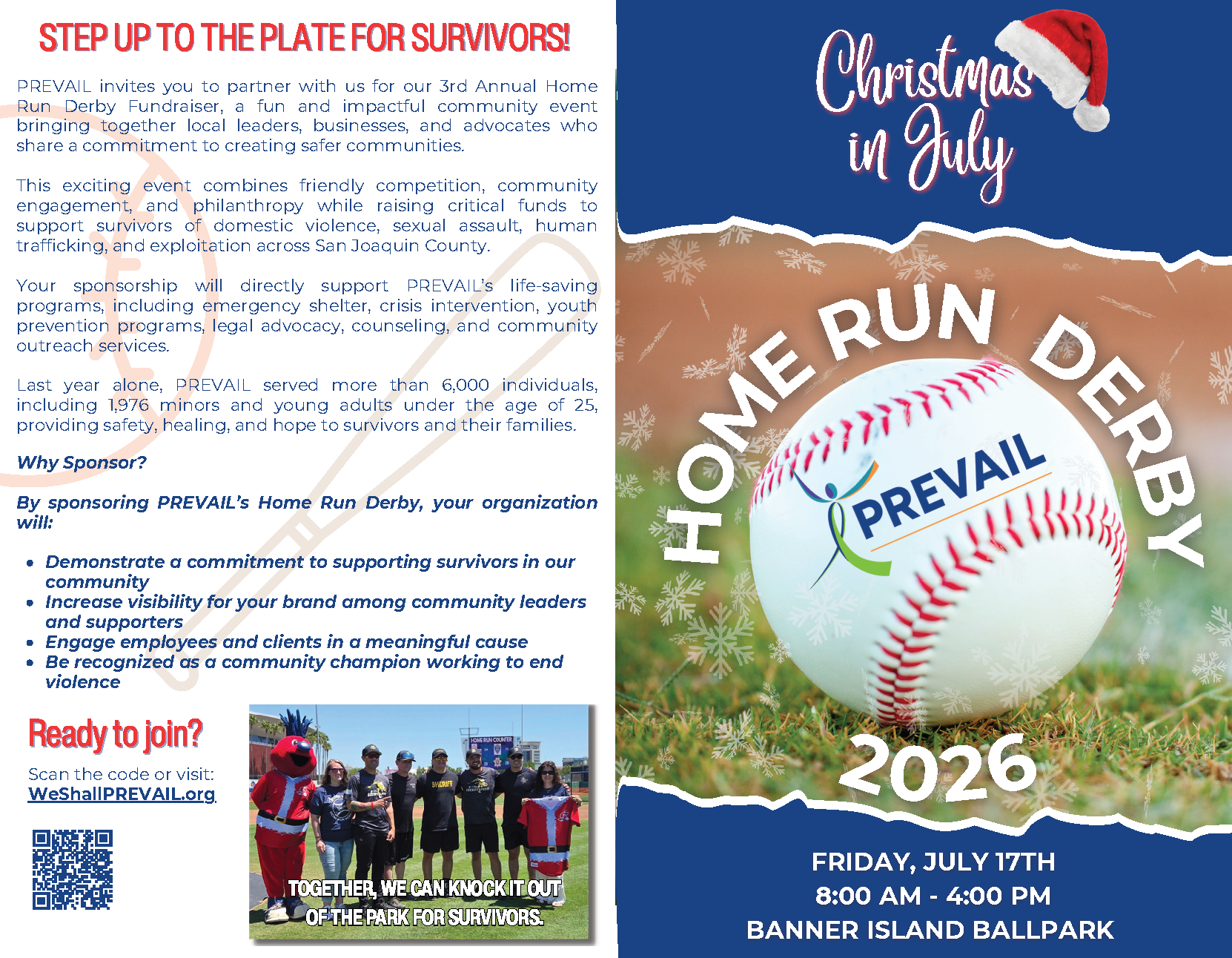By participating in the Home Run Derby, you are helping PREVAIL continue providing critical services to survivors of domestic violence, sexual assault, human trafficking, and at-risk homeless youth. Your support brings hope, healing, and stability to those who need it most.
